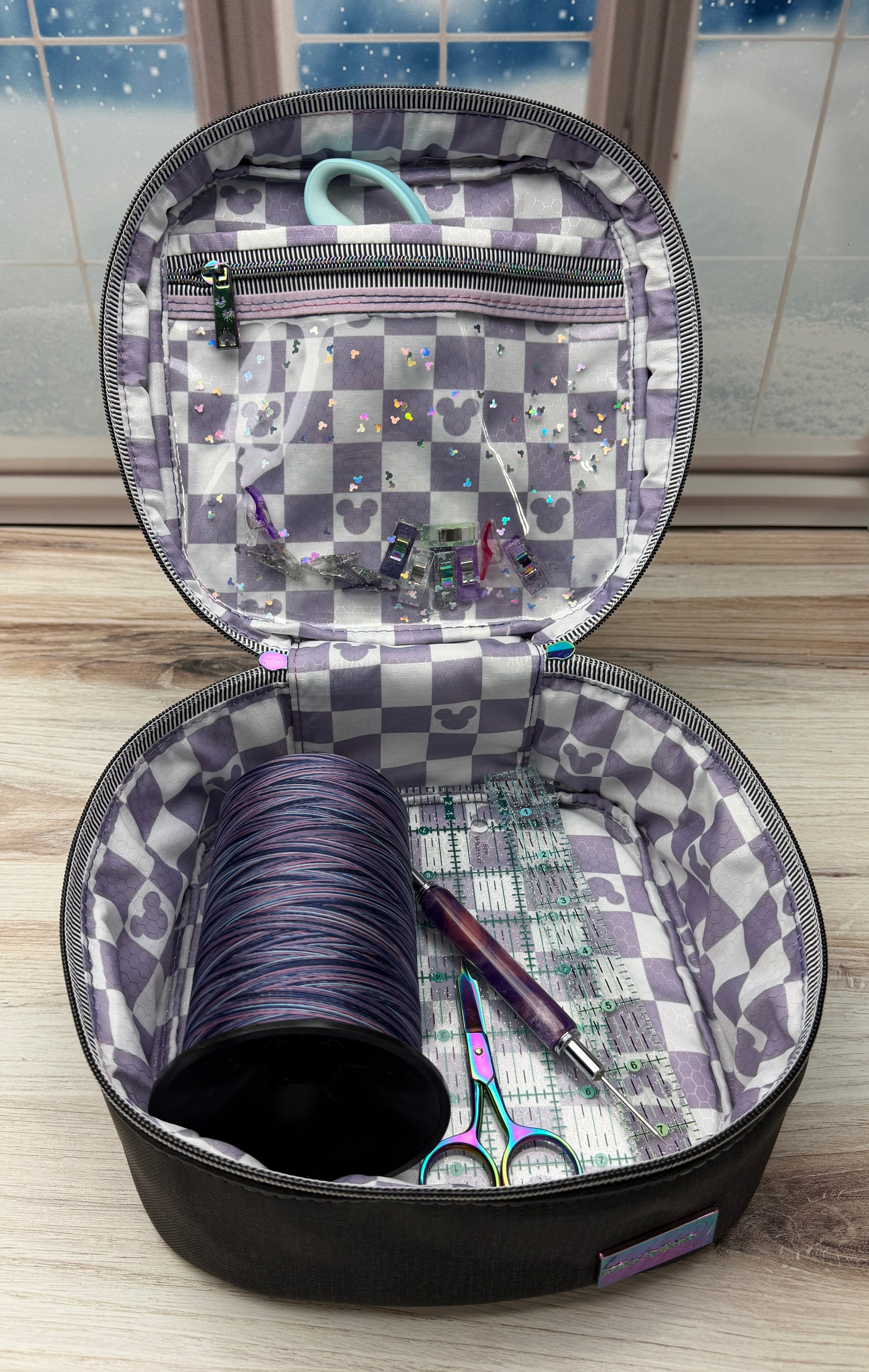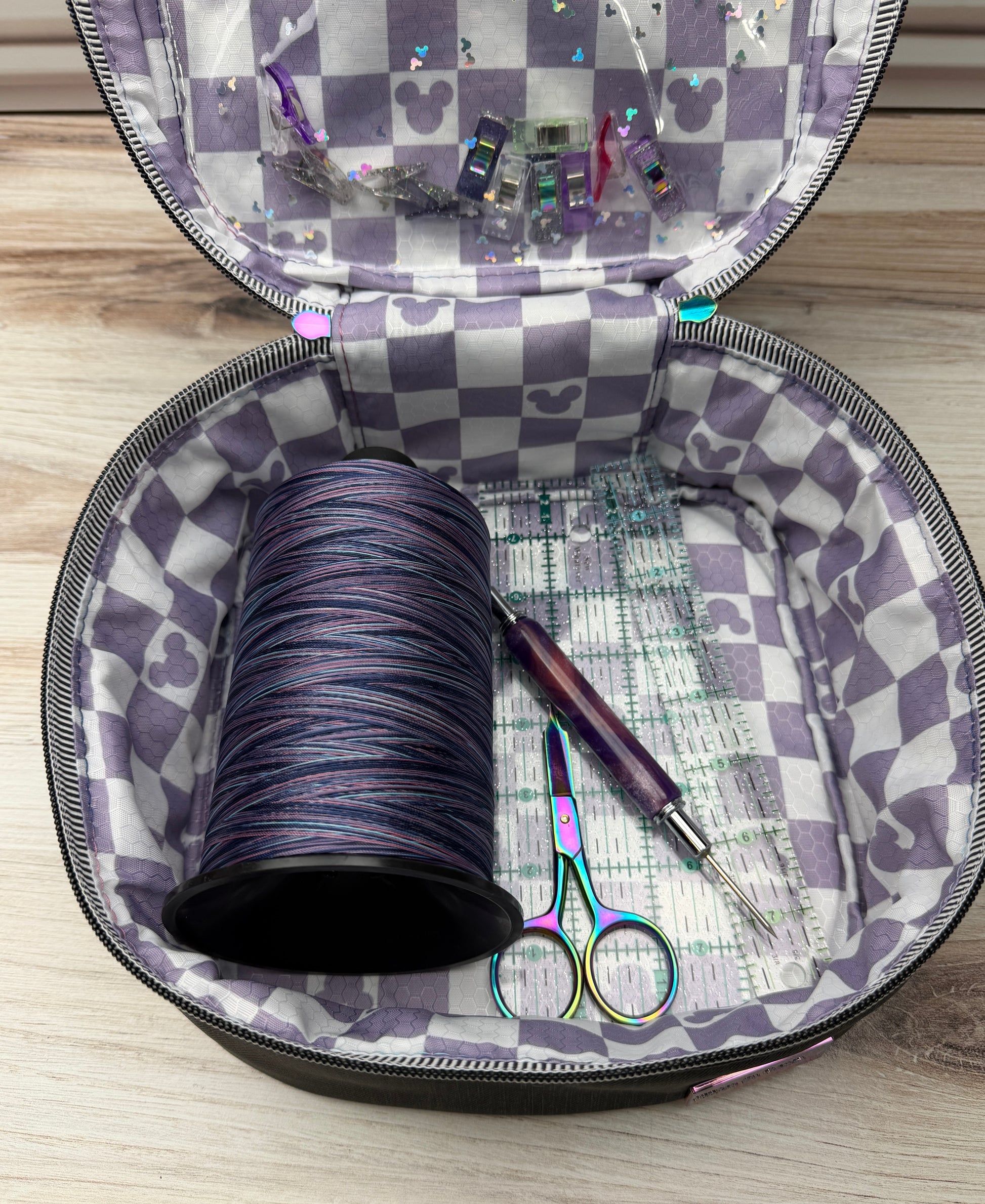 The Medium Sized Hazel features a quilted black exterior with purple mouse checks, providing both style and functionality. Its padded design offers enhanced protection for your belongings during travel, ensuring safety and durability. This travel bag is an excellent choice for secure and organized transportation.