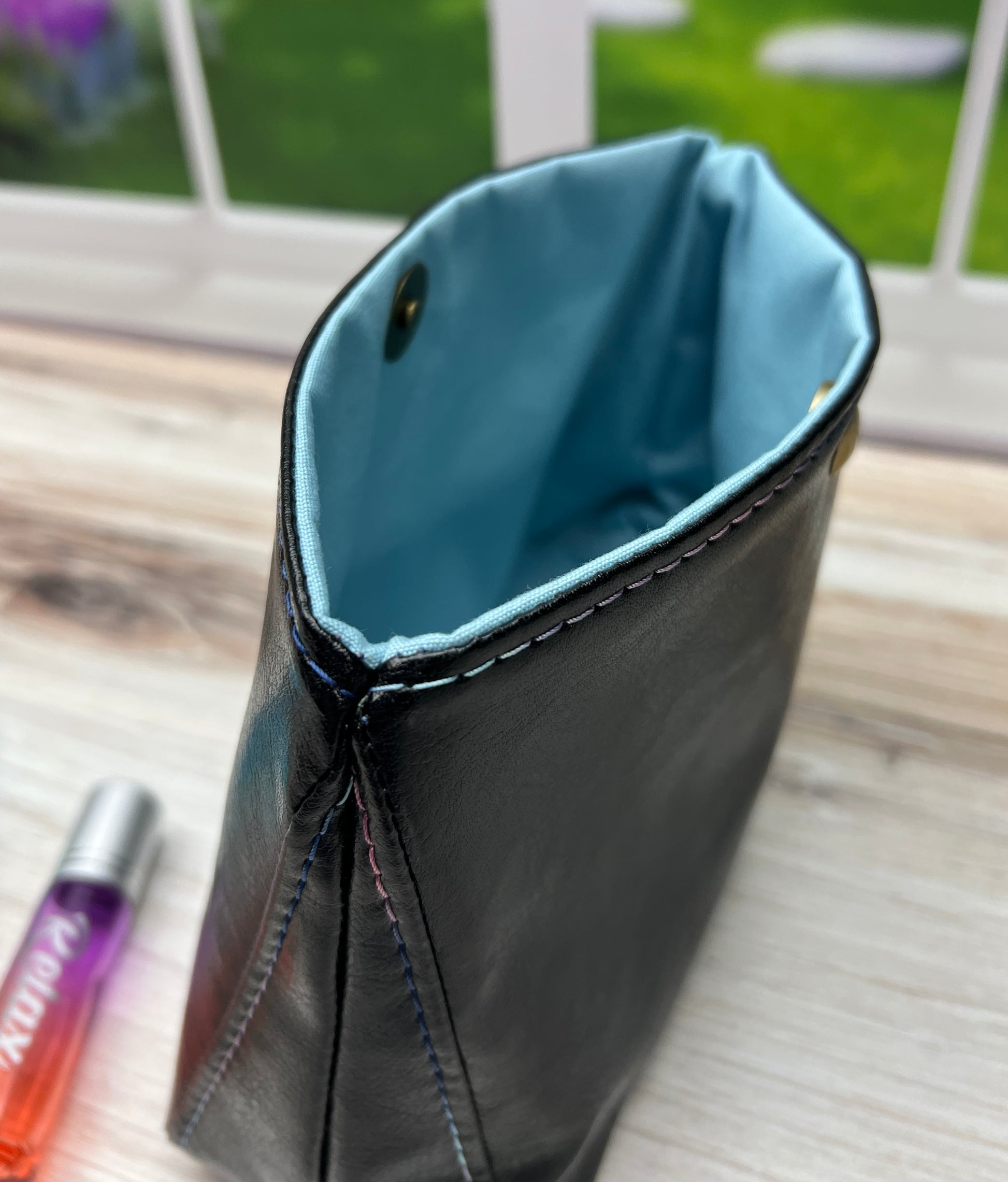Discover the perfect on-the-go accessory with our Small Cosmetic Bag! The black vinyl exterior and blue water resistant canvas lining ensure durability and style. With a convenient magnetic snap closure, it's easy to access your essentials while on the move. Compact yet spacious enough to fit in any purse, this bag is a must-have for all your beauty needs.